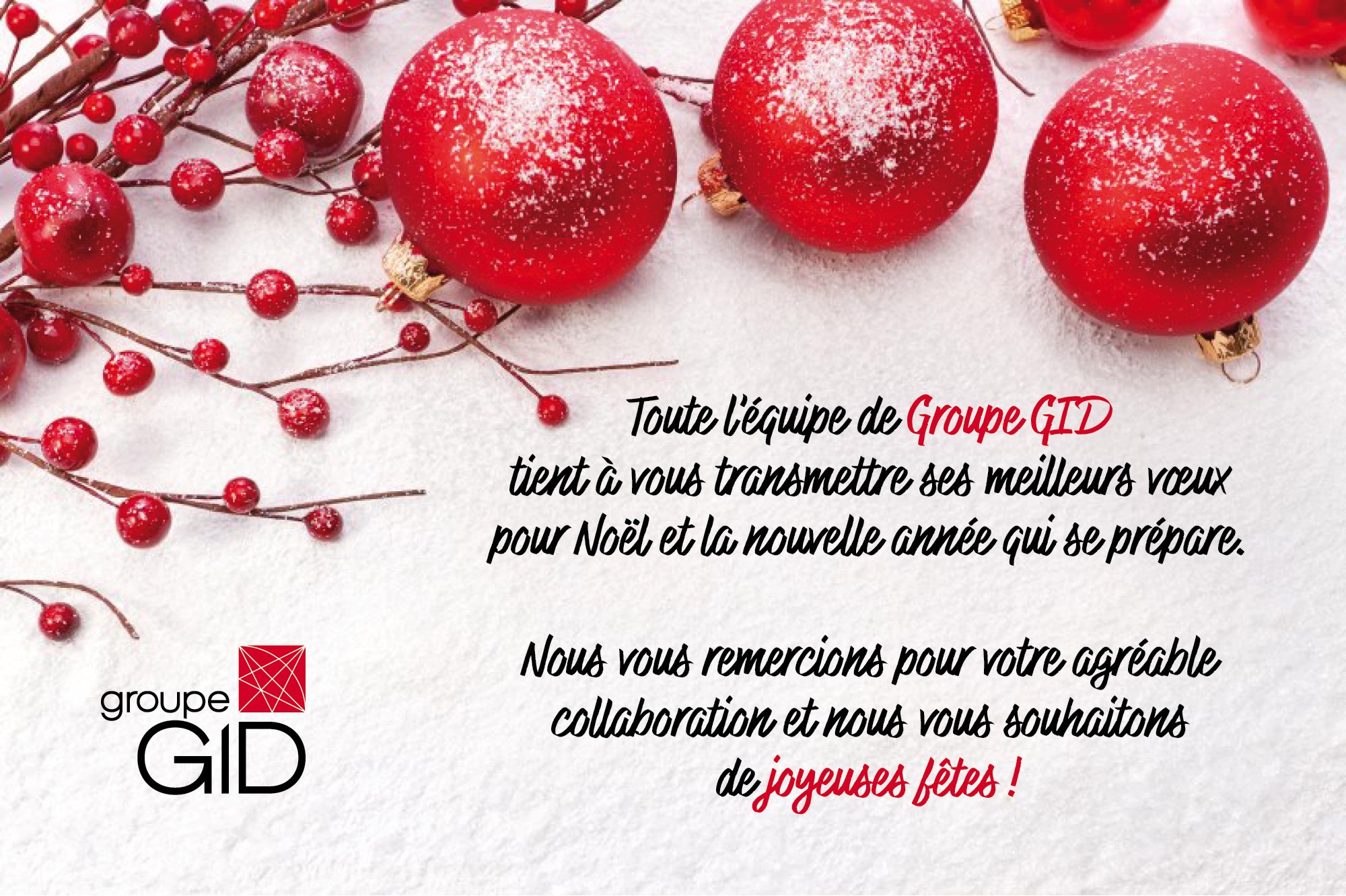 L’équipe de Groupe GID vous souhaite ses meilleurs vœux pour un temps des fêtes rempli de bonheur et de réjouissance. Nos bureaux sont fermés pour la période des Fêtes du 22 décembre au 4 janvier 2026. Nous vous reviendrons la tête pleine d'idées pour vous accompagner dans vos projets !